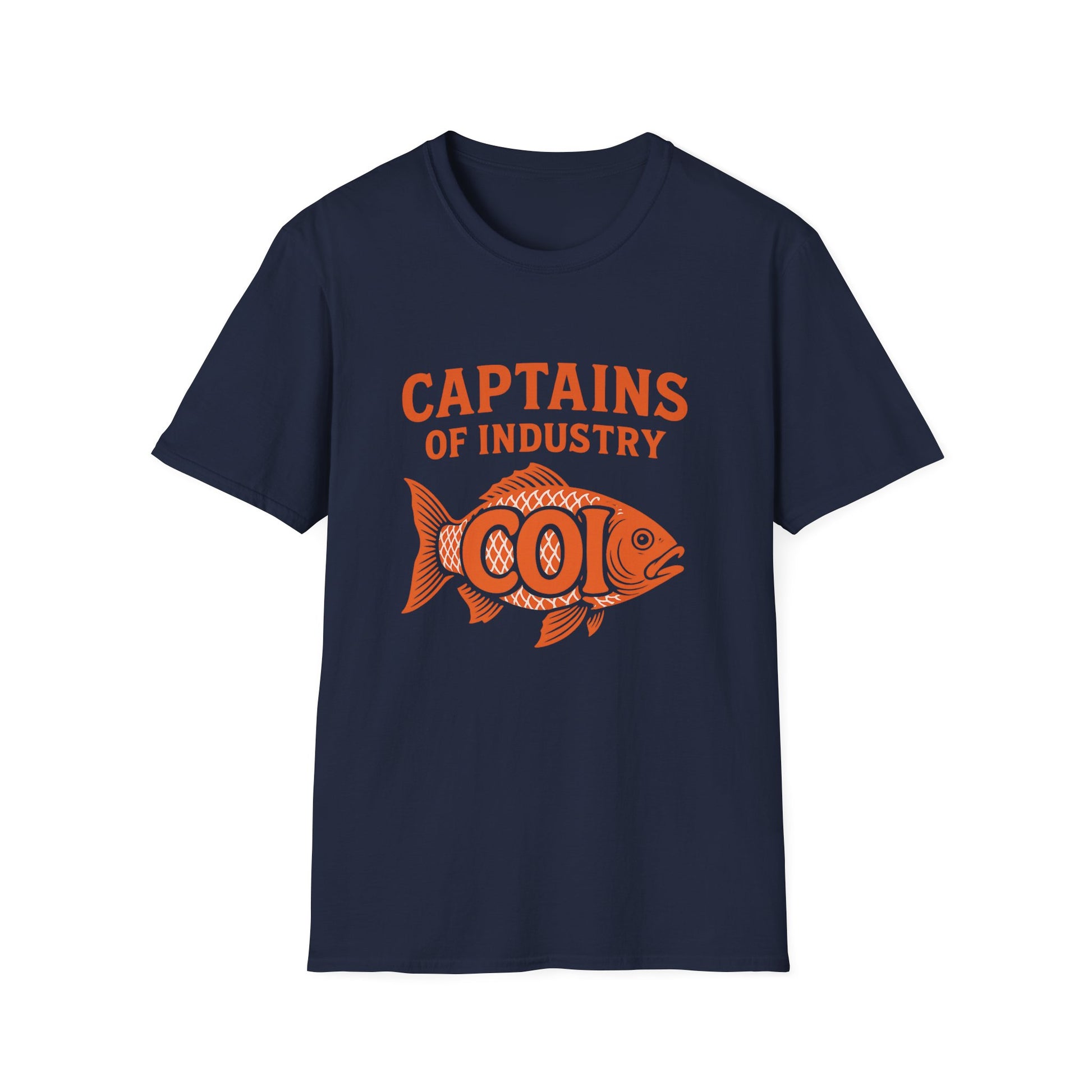 Lightweight and wearable, this crew-neck tee carries a vintage-inspired, hand-printed fish graphic that reads “Captains of Industry.” The soft, ring-spun cotton drapes naturally and keeps its shape thanks to ribbed collar and shoulder tape. It slips into days on the water, casual meetups, and low-key work socials — layered under a denim jacket or worn solo. The distressed orange screenprint has a retro trade-card vibe that nods to small crews, boatyards, and makers who value craftsmanship and honest design.